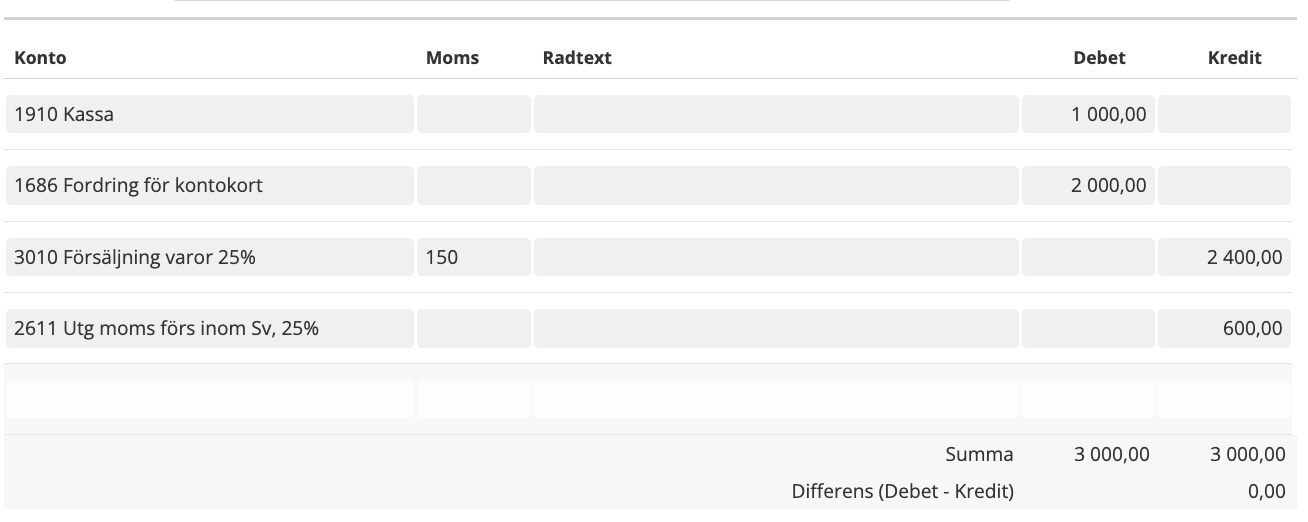 Nedan finns lite exempel på hur bokföringen av dagskassa kan se ut. I detta exempel har vi sålt för 3000kr (1000kr kontant och 2000kr via kort).