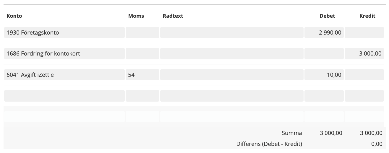 Zettle är en form av kortbetalning, där en avgift för tjänsten dras av i samband med att pengarna betalas ut till dig. Om du tar betalt med Zettle så ser bokföringen för försäljningen ut såhär:
