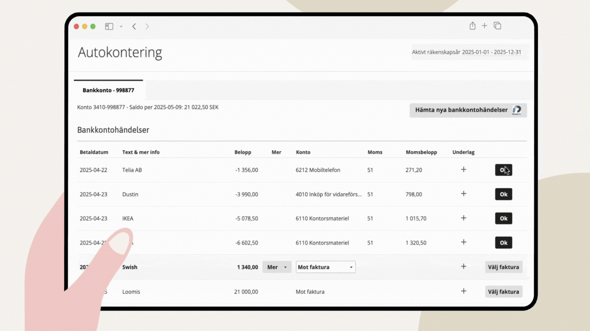 Du godkänner händelser med OK. Då bokförs allt automatiskt på debet och kredit i bakgrunden!